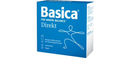 - Basica® Direct – alkaline granules: for direct intake without water during work or on the go, with a fresh lemon taste, lactose-free